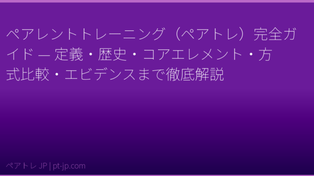 この記事は、ペアレントトレーニング(ペアトレ)について日本語で最も詳しい解説記事を目指してまとめたものです。厚生労働省のガイドブック・支援者用マニュアル、主要な学術文献をもとに、定義から歴史、コアエレメント6要素、主要方式の比較、エビデンス...